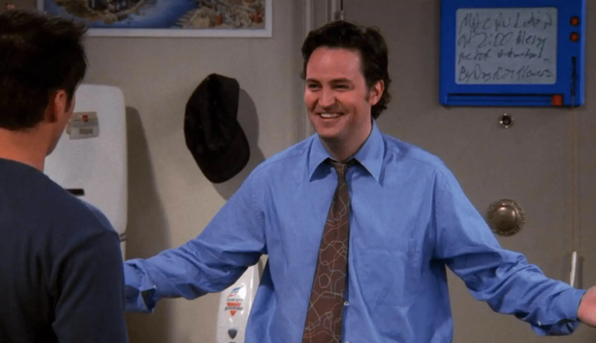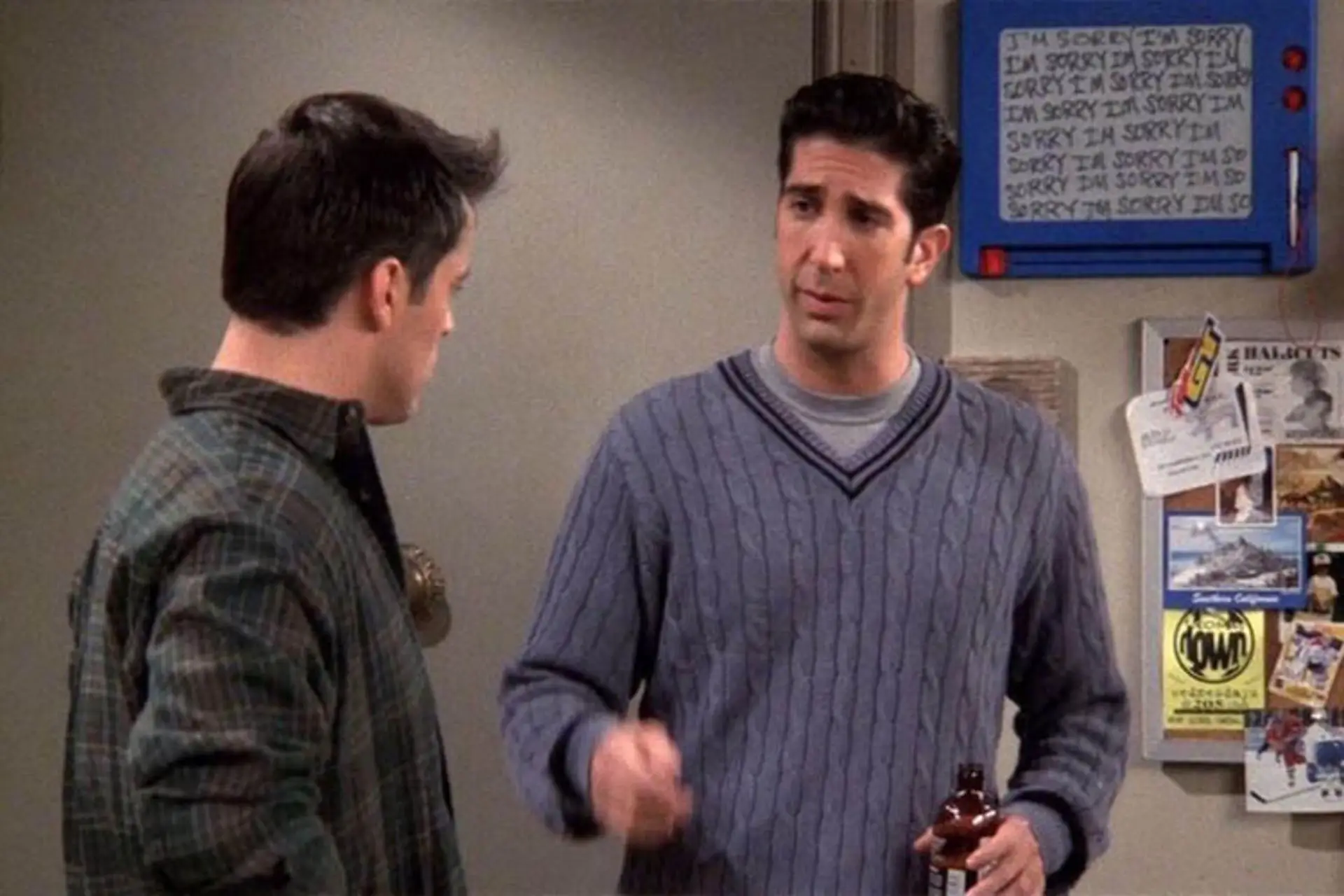 به جرئت میتوان گفت یکی از جالبترین و بامزهترین جزییات فیلم، وایتبرد خانهی جویی و چندلر است. اگر بخواهیم به تمام جزییات آن بپردازیم این مقاله بسیار طولانی خواهد شد. اگر با دقت سریال را تماشا کنید، در طول سریال محتویات روی وایتبرد پشت در ورودی خانهی جویی و چندلر دائما درحال تغییر است. این جزییات وابسته به داستان سریال در همان قسمت تغییر میکنند. برای مثال زمانیکه جویی از چندلر عصبانی است، روی وایت برد تعداد زیادی عبارت I’M SORRY (عذر میخواهم) نوشته شده است یا در زمانیکه راس از رابطهی مانیکا و چندلر آگاه میشود، روی وایت برد یک قلب با حروف ابتدایی اسم آن دو نفر به چشم میخورد. در طول سریال ۳۲ بار محتویات این وایتبرد تغییر میکند؛ پس اگر از این موضوع اطلاع نداشتید، در آینده با دقت بیشتری به رابطهی داستان سریال و این وایتبرد دقت کنید.