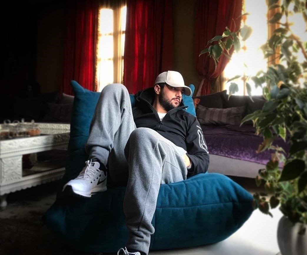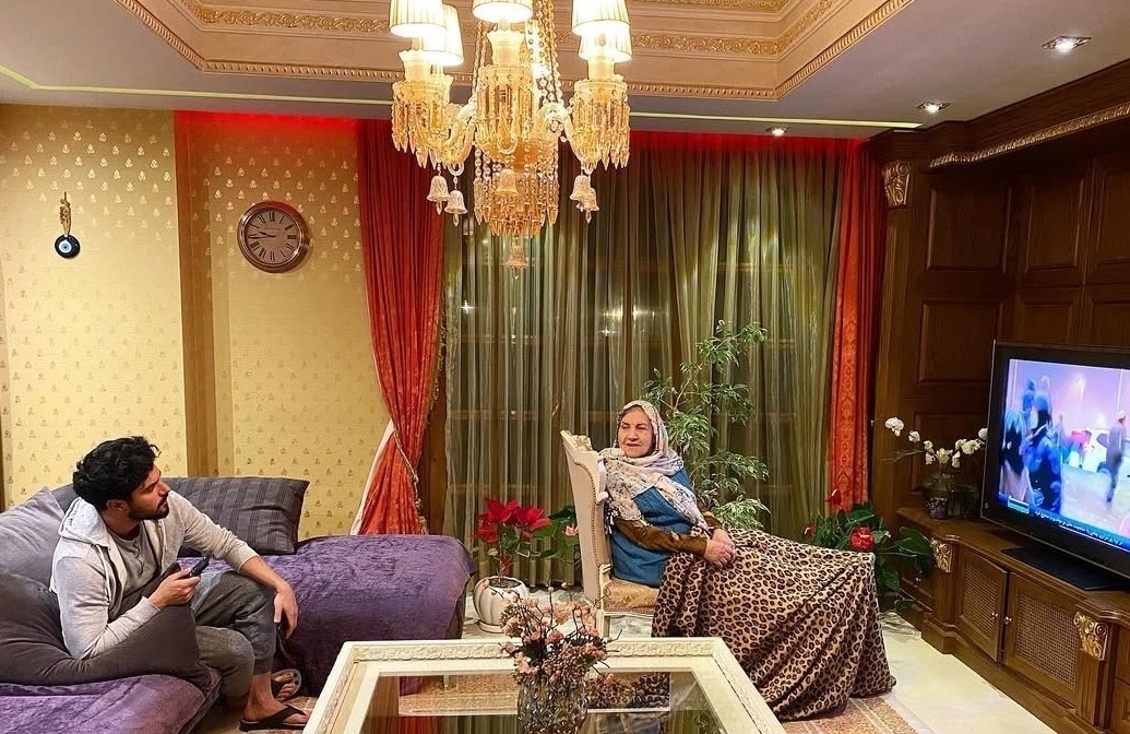 دیوار چوبی در پشت تلویزیون با گلآرایی و نور مخفی، تمرکز بصری را به سمت فضای تلویزیون هدایت میکند. همچنین وجود گلهای طبیعی و گلدانهای تزیینی در اطراف فضا نشاندهنده توجه به جزئیات و علاقه به زیبایی در دکوراسیون است. صمیمیت تصویر با حضور مادربزرگ و سینا مهراد که در حال تماشای تلویزیون هستند، نمایی گرم و خانوادگی از این محیط لوکس ایجاد کرده است.