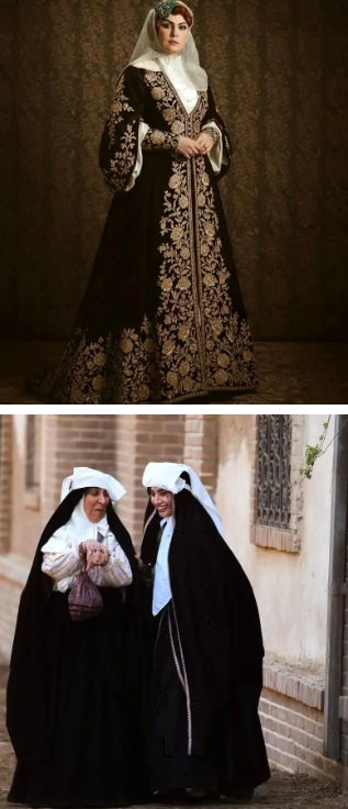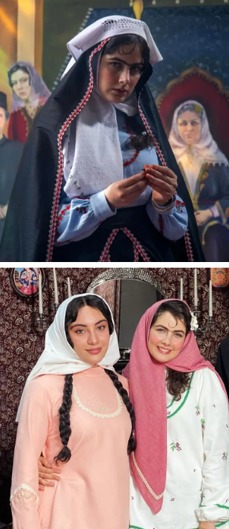 یکی دیگر از ویژگی های مشترک استایل زنان، استفاده از روسری های قواره دار و بلند است. شیوه بستن روسری و هدایت یک سمت آن به عقب، از ارکان اصلی استایل زنان در دوران قاجار به شمار می رفت که در این سریال نیز به درستی بازآفرینی شده است
