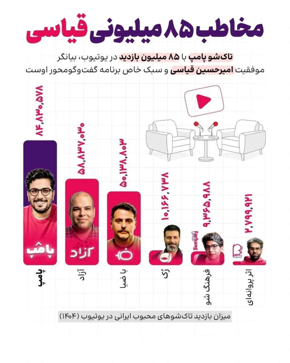 امیرحسین قیاسی با آن خنده‌های انفجاری، بعضاً اگزجره و بی‌مهابا، دقیقاً همان مهره‌ای است که در این زیست‌بوم برنده می‌شود. او برخلاف سنت اتوکشیده اجرا، با شکستن کلیشه‌ها و خلق فضایی که در آن «خندیدن به پوچی‌ها» مجاز است، صمیمیتی کمیاب می‌آفریند که مخاطبِ گریزان از جدیت، تشنه‌ی آن است. ثبت رکورد ۸۵ میلیون بازدید برای «پامپ» تثبیت حکمرانی مطلق ژانر سرگرمی در یوتیوب فارسی است.
