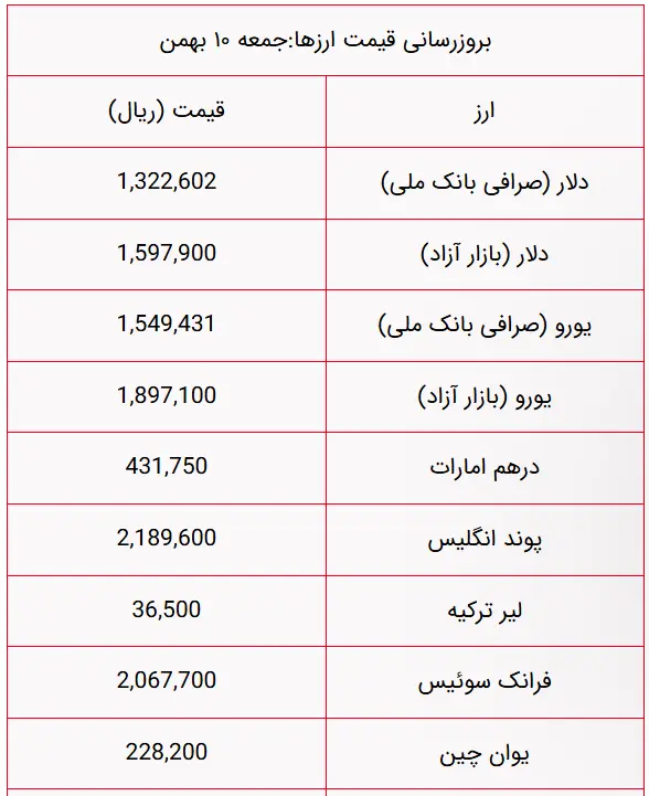 قیمت دلار و یورو امروز جمعه ۱۰ بهمن ۱۴۰۴ با روندی صعودی همچنان در اوج باقی ماند و بازار ارز را تحت تاثیر قرار داد.