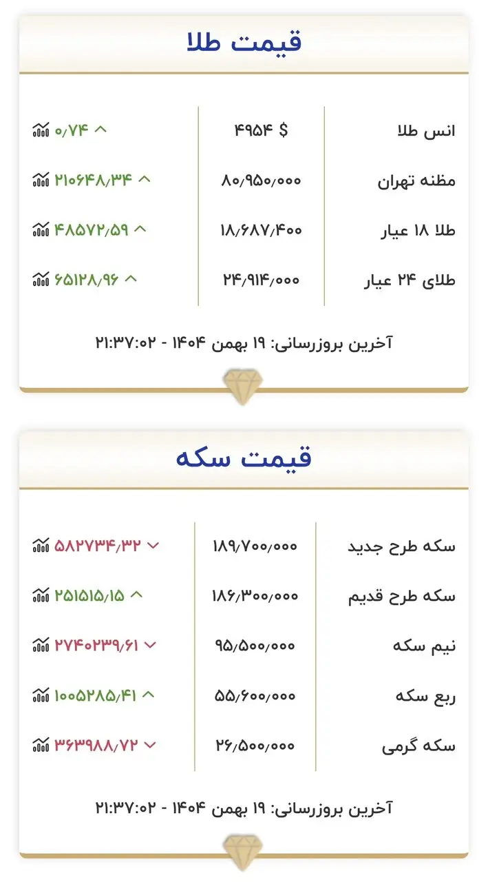 آخرین قیمت طلا و سکه در معاملات ۱۹ بهمن