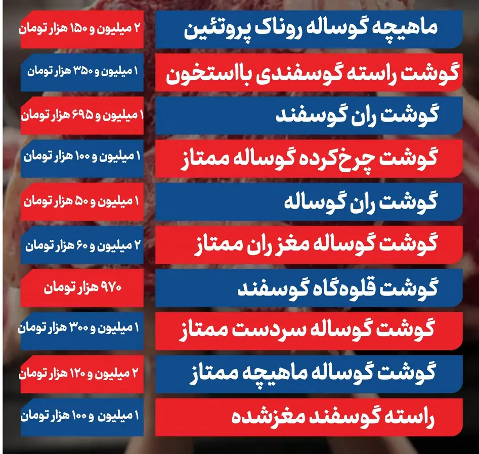 قیمت گوشت قرمز امروز دوشنبه ۲۷ بهمن ۱۴۰۴ براساس استعلام از میدان میوه و تره بار اعلام شد. قیمت گوشت قرمز امروز ۲۷ بهمن ۱۴۰۴ اعلام شد. گزارشها نشان میدهد که نرخ گوشت گوسفند و گوساله ثابت مانده و جهشی نداشته است. همچنین گفتنی است هیچ اختلال یا کمبودی در دسترسی به محصولات مشاهده نشده است و فعالیتها باثبات قابل توجه ادامه دارد.