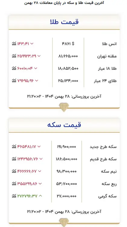 قیمت طلا و سکه در ۲۹ بهمنماه اعلام شد.