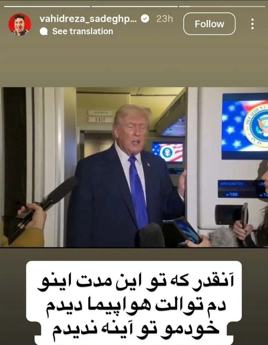وحیدرضا صادقپور، بلاگر و بازیگر مشهور، با استوری جنجالی درباره محل گفتوگوی دونالد ترامپ در هواپیما، کاربران را به واکنش واداشت.